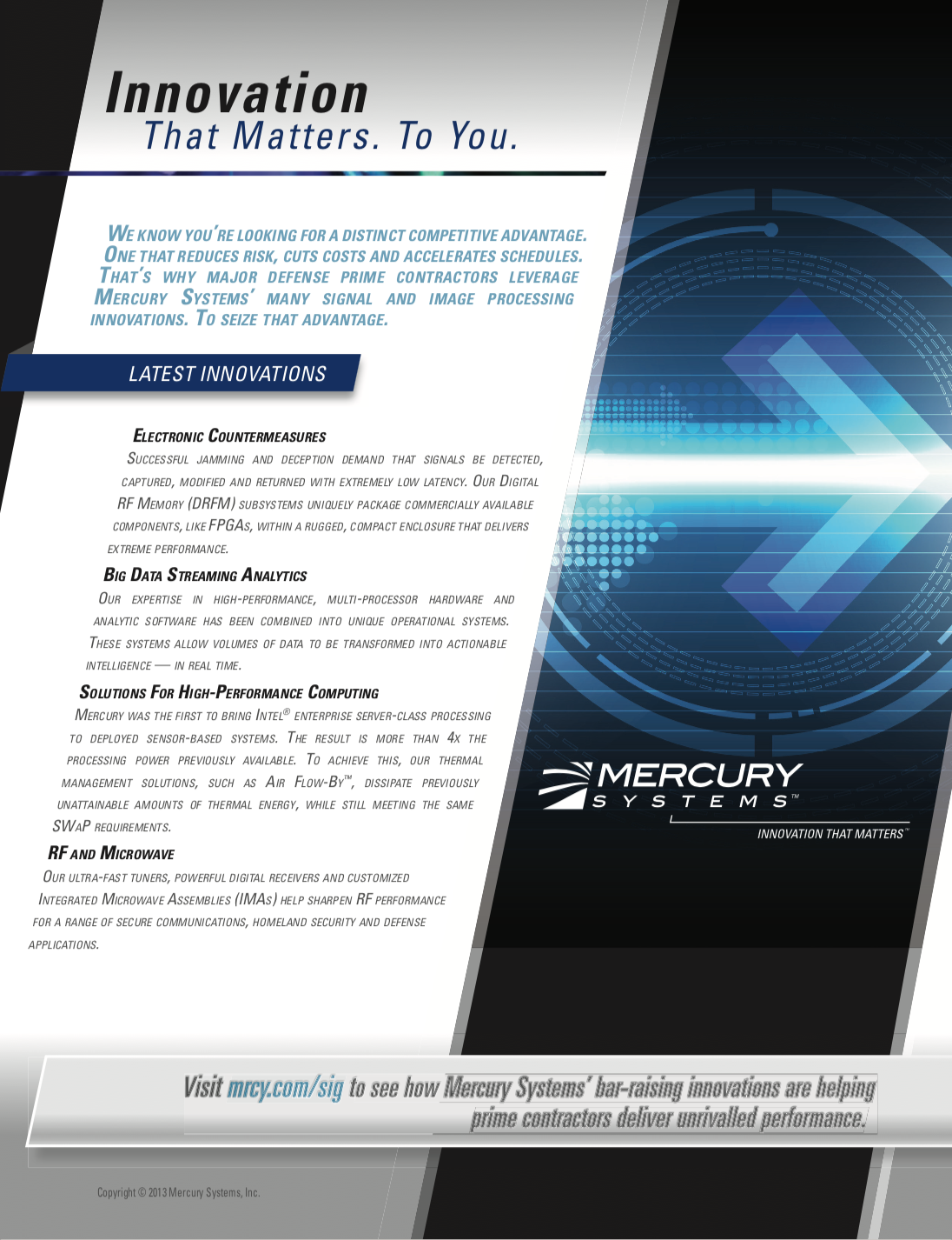 Mercury Systems was challenged with a heavy workload. After a brief introductory, Mckean Design partnered and provided Mercury Systems with new print and digital collateral fast. This relationship led to a refresh in their brand and ultimately saved this company from high costs to big design agencies. Mckean Design provided a wide range of deliverables such as traditional and digital advertising, brochures, sell sheets and white paper templates and several other miscellaneous graphics.